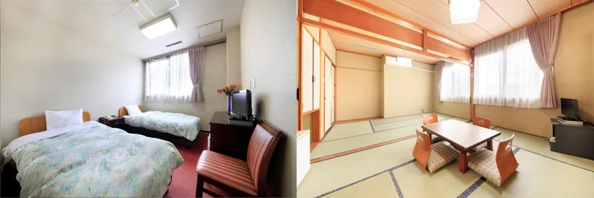 洋間客室(左)と、和室客室(12畳間)