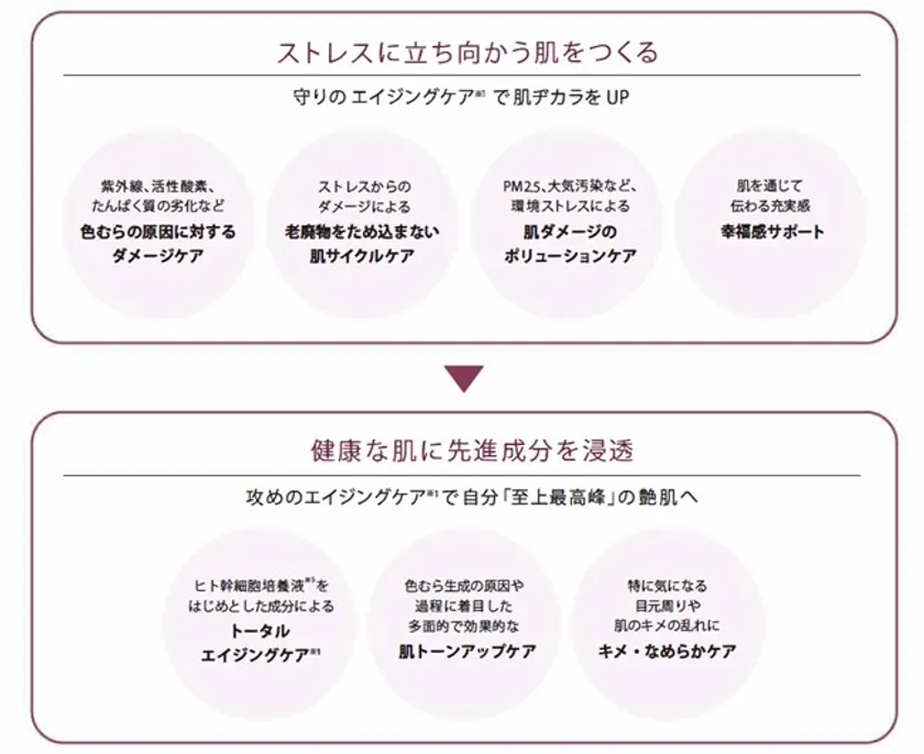 低刺激ながらパワフルにキメ・なめらかさを追求し、肌トーンアップ、ハリ・弾力を叶える「攻め」のエイジングケア※2に、肌のダメージケアやうるおい力をアップする「守り」のエイジングケア※2を組み合わせることで、色むらやくすみ※5知らずの輝く肌を目指します。