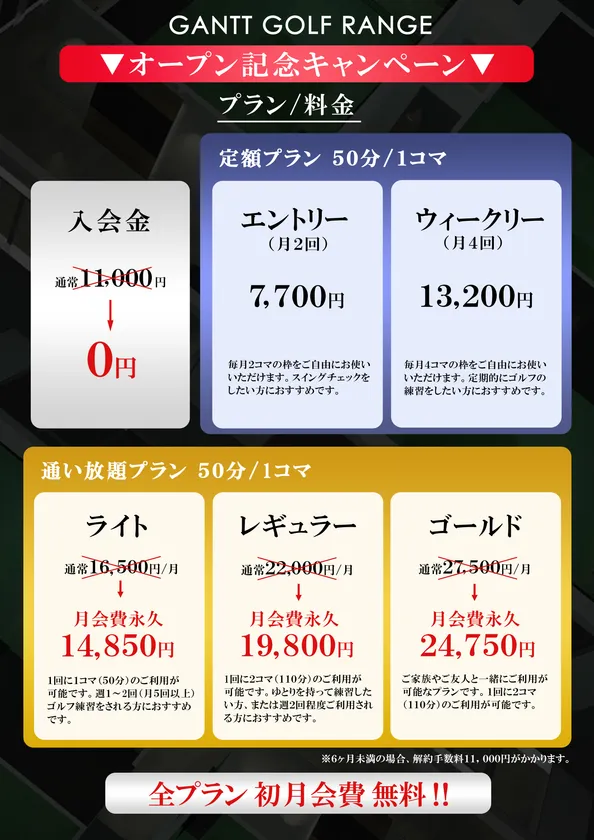 GANTT GOLF RANGE 江坂店では、ご利用頻度に合わせて選べる5つの月額プランをご用意しています。