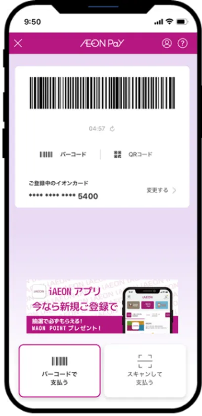 ※1:「AEON Pay」はイオンのトータルアプリ「iAEON(アイイオン)」またはイオンカード公式アプリ「イオンウォレット」をダウンロードいただき、イオンマークのカードを登録することで利用可能となります。イオンのグループ店舗をはじめとした全国のAEON Pay加盟店のレジにて、スマートフォンに表示されたコードを提示することで、簡単に決済することができます。