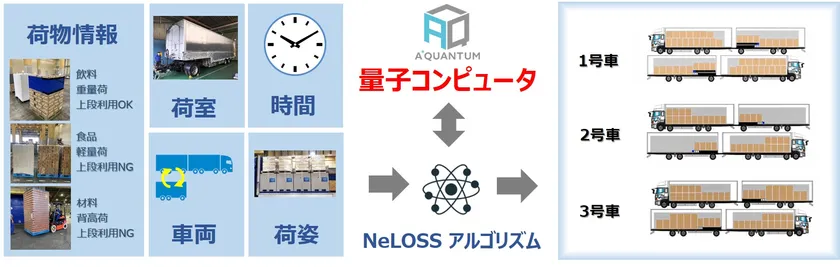 今般、NLJでは、本課題の解決を目指し、株式会社エー・スター・クォンタム(本社:東京都港区、社長:船橋 弘路)の量子コンピューティング技術を活用した、配車×積み付けの組み合わせを高速自動計算するシステム「NeLOSS」の運用を開始いたしました。
