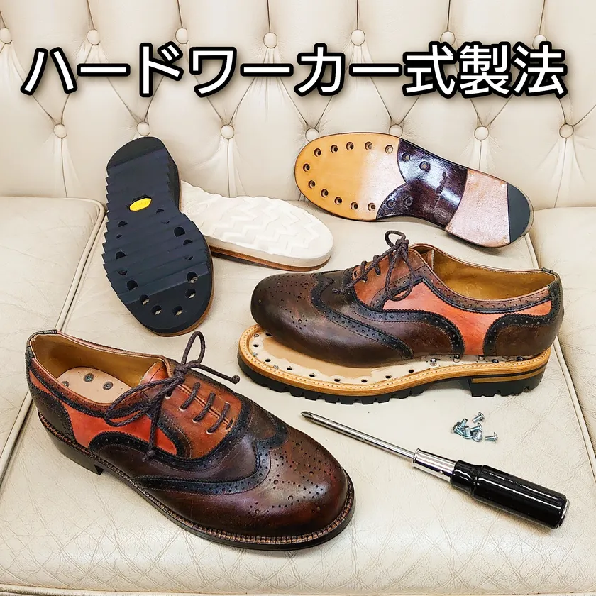 ソールスワップシステムが実装できるだけではなく、寿命の長いオイルレザーを使用しても、ネジとナットを使用しているため、セメンテッド式製法のように、接着不良を心配する必要もなく、グッドイヤーウェルト式製法やマッケイ式製法のように、高価な機械も使用しません。