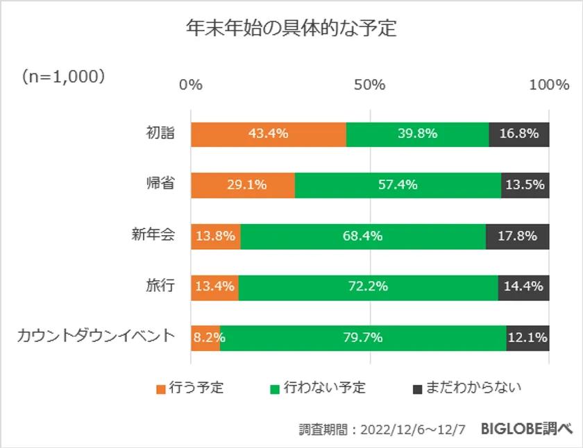 一方で、1,000人全員に「年末年始の具体的な予定」を尋ねたところ、43.4%の人が「行う予定」として「初詣」と回答した。