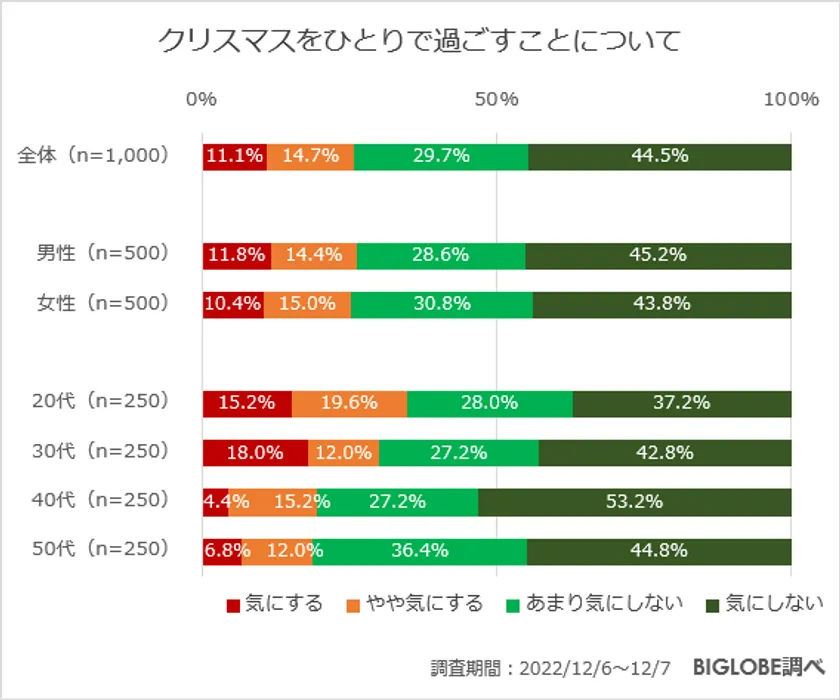 「クリスマスをひとりで過ごすことについて」との質問には全体の74.2%が「あまり気にしない/気にしない」と回答。年代があがるにつれ、この割合は多くなった。