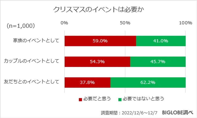 「クリスマスのイベントは必要か」との問いには、「家族のイベントとして」と「カップルのイベントとして」では「必要だと思う」と回答した割合は半数を超えた一方、「友だちとのイベントとして」では「必要だと思う」との回答は37.8%と4割以下となった。