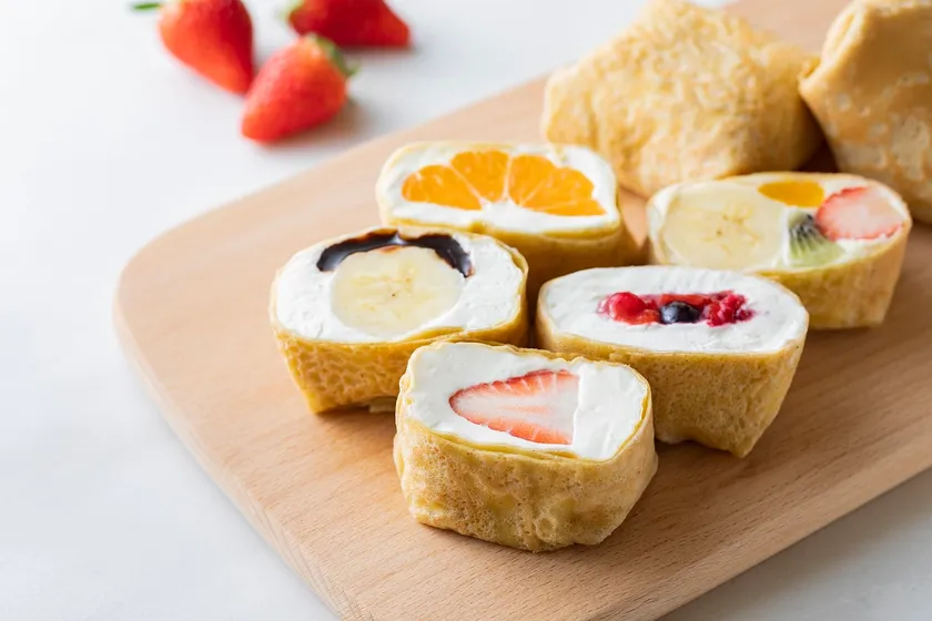 瑞々しい新鮮なフルーツをたっぷり詰め込んだ、宝石箱のように輝くクレープです。口の中で様々な食感・風味が重なり合います。