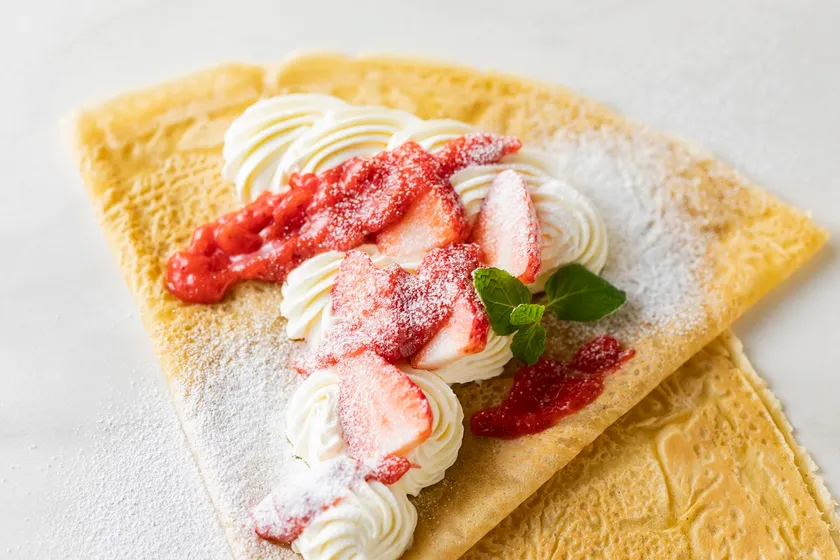 マスカルポーネチーズを混ぜ込んださっぱりと酸味の効いたクリームと、自家製いちごジャムのフルーティーな美味しさを一度に味わえるクレープです。