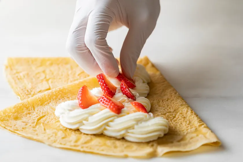 自家製生クリームとカスタードを1枚ずつ手焼きするもちもち生地で包んだクレープです。シンプルだからこそ手作りの美味しさが際立ちます。