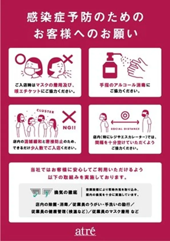 アトレでは、お客さま、従業員及び関係者の皆様の安全性を考慮し、新型コロナウイルス感染拡大防止の為の対策を講じます。また、来店されるお客さまへのご協力のお願いがございます。