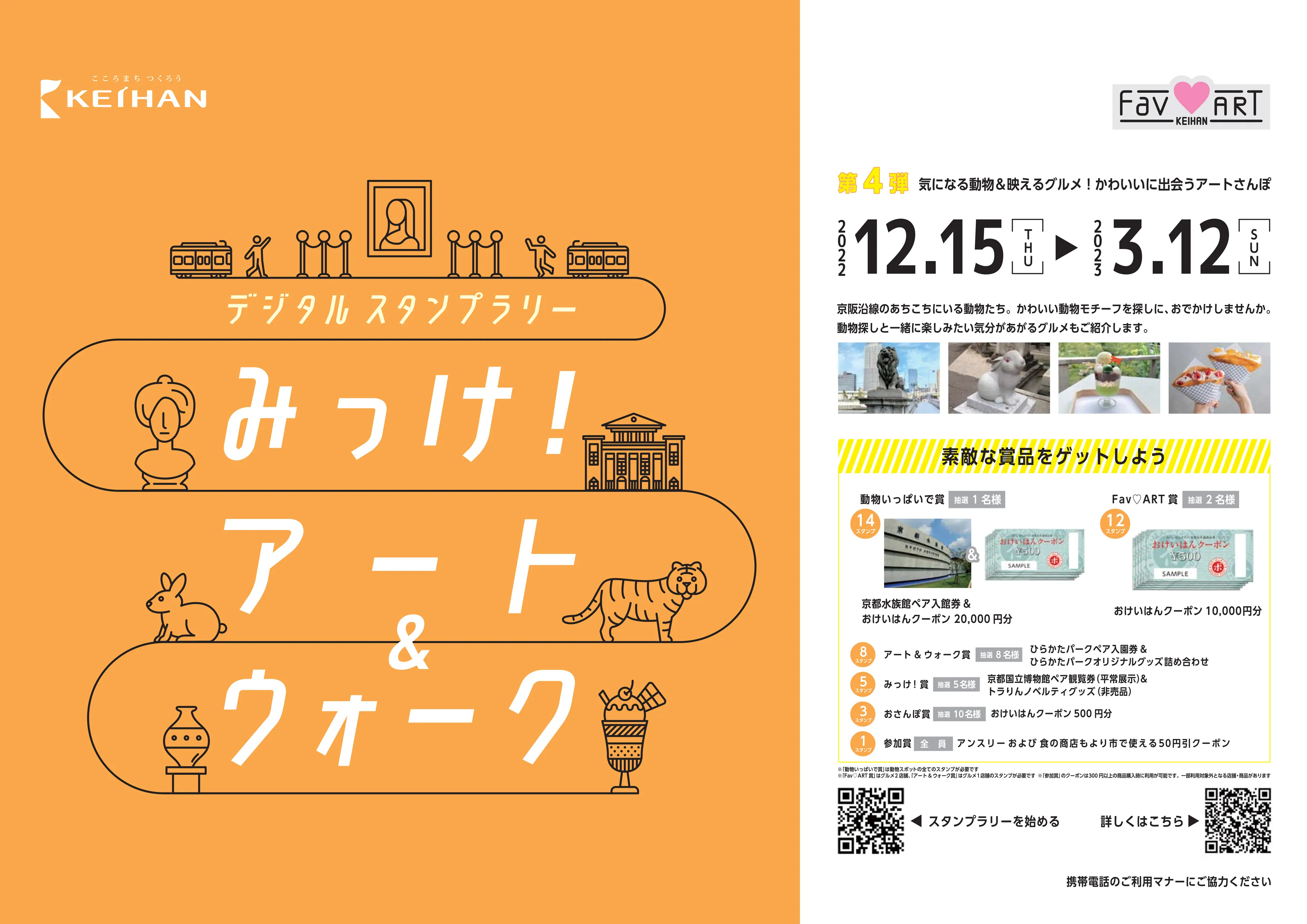 京阪ホールディングス株式会社(本社:大阪市中央区、社長:石丸昌宏)では、2022年2月に大阪中之島美術館が開業したことを機に、沿線の賑わい創出の一環として「アート」をテーマにした通年企画「Fav ART KEIHAN」を実施中です。その企画の一環として、京阪沿線のアートをめぐる連続企画「デジタルスタンプラリー みっけ!アート&ウォーク」の第4弾「気になる動物&映えるグルメ!かわいいに出会うアートさんぽ」を2022年12月15日(木)から2023年3月12日(日)まで実施します。