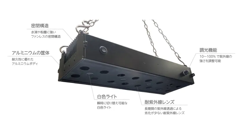 10~100%で調整可能な調光機能により、紫外線強度を任意に設定することができます。白色ライトも搭載しており、スイッチを押すだけでUVライトと白色ライトの切り替えが可能です。さらに耐久性に優れたアルミニウムの筐体と、粉塵・水滴を防ぐファンレスの密閉構造により悪環境でも安心して使用することができます。