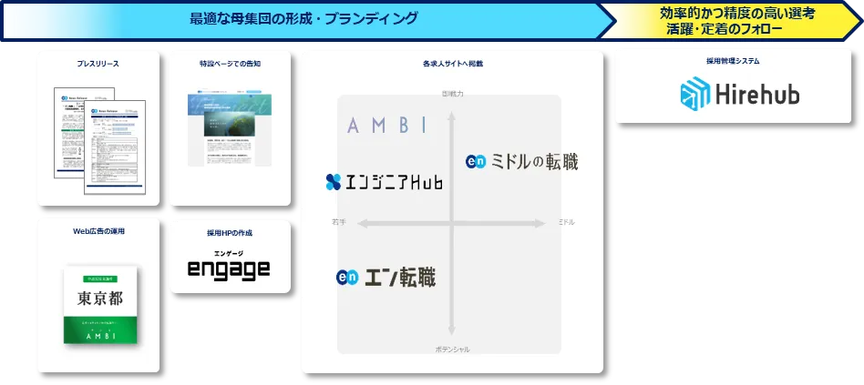 プレスリリースや特設ページ、採用HPの作成、Web広告を用いた告知に加え、各求人サイトでの集客サポートを実施いたします。『エン転職』『AMBI』『ミドルの転職』『エンジニアHub』とターゲットの異なる4つの求人サイトを活用することで、ターゲットへ網羅的に求人を届けます。また採用管理システム『HireHub』も提供。集客に限らず選考フロー・入庁後の支援も行なうことで、求職者と東京都の適切なマッチングに寄与いたします。