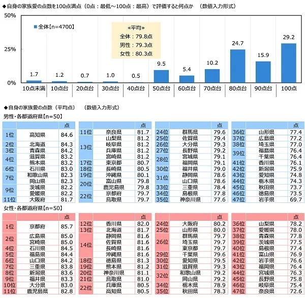 全回答者(4,700名)に、自身の家族愛の点数を100点満点(0点:最低~100点:最高)で評価すると何点か聞いたところ、「100点」(29.2%)に最も多くの回答が集まり、「80点台」(24.7%)や「90点台」(15.9%)にも多くの回答がみられ、平均は79.8点でした。家族と強い絆を結ぶことができている、家族に対してしっかりと愛情を注ぐことができていると感じている人が多いのではないでしょうか。