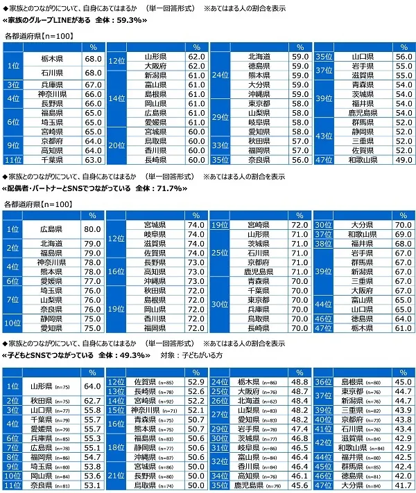 ・「配偶者・パートナーとSNSでつながっている」全体の72%、都道府県別の1位は広島県