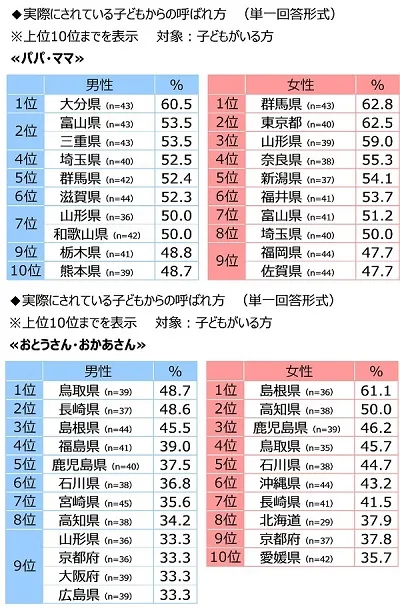 「“パパ”と呼ばれている」のが最も多いのは大分県、「“ママ”と呼ばれている」のが最も多いのは群馬県