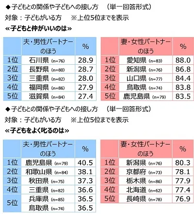 ≪子どもをよく叱る≫では、『夫・男性パートナーのほう(計)』が最も高くなったのは鹿児島県(40.5%)、『妻・女性パートナーのほう(計)』が最も高くなったのは新潟県(80.3%)でした。