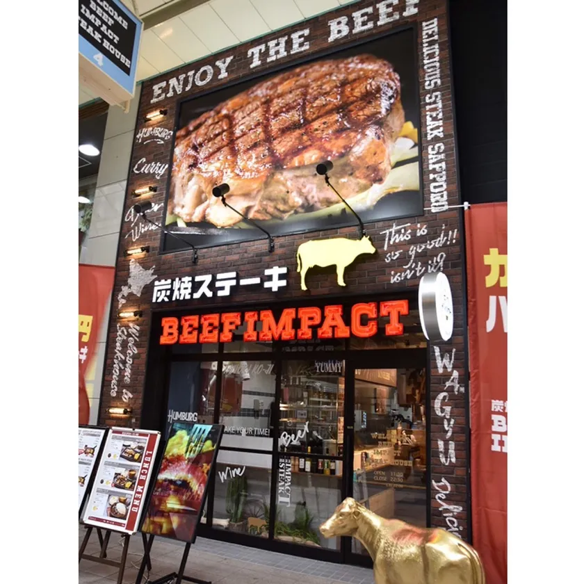 厳選したこだわりの牛肉をこんがりと炭火で焼き上げ、厚切りのステーキをリーズナブルに大胆にご提供。2022年11月で8周年を迎えた、北海道で人気のビーフインパクトは2021年4月に「フレスポ帯広店」をオープンさせており、この度オープンする伏古店はビーフインパクト13店舗目となります。