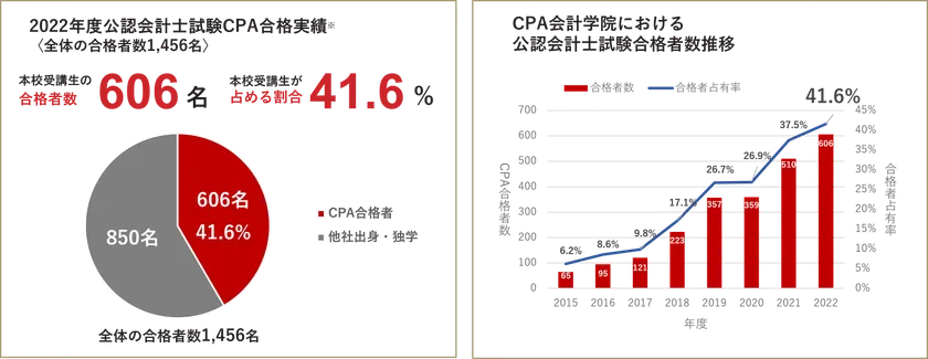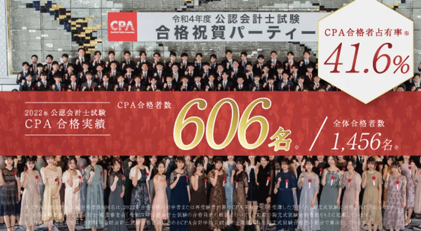 CPAエクセレントパートナーズ株式会社(所在地:東京都新宿区、代表取締役:国見 健介)は、運営する公認会計士資格スクール「CPA会計学院( https://cpa-net.jp/ )」が令和4年 公認会計士試験において、606名(全体合格者1,456名※1)の合格者を輩出したことを発表いたします。同試験の全体合格者の41.6%(約2.4人に1人)がCPA会計学院の受講生となり、7年連続で合格者数を更新いたしました。