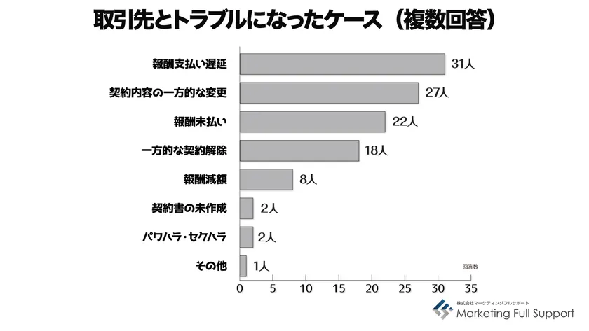 トラブル内容は、1位「報酬支払い遅延」、2位「契約内容の一方的な変更」、3位「報酬未払い」となり(複数回答)、報酬や契約関連のものが目立ちました。