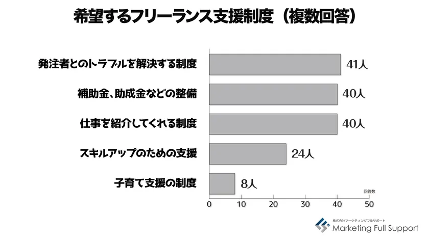 その一方で、2割強が「取引先とトラブルを経験した」と回答。トラブル内容は、1位「報酬支払い遅延」、2位「契約内容の一方的な変更」、3位「報酬未払い」と、報酬や契約関連のものが目立ちました。希望する支援についても、「補助金、助成金の整備」(2位)、「仕事を紹介してくれる制度」(3位)を抑えて、「発注者とのトラブルを解決する制度」(1位)が最も多いという結果になりました。