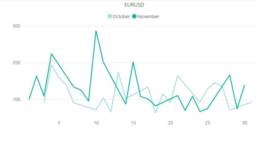 ユーロ円(EUR/JPY)の10月・11月のボラティリティ推移の比較から、11月は10月と比べて、相対的にボラティリティに恵まれなかった1か月間だったことが確認できます。ボラティリティが最大を記録したのは米国CPIの発表があった10日ですが、数値は先月比で約100pipsほど減少しました。また、11月の平均ボラティリティ154pipsは、10月の167.5pipsと比べてわずかに縮小しています。ポンド円(GBP/JPY)に関しても同様のボラティリティ縮小を見せていることから、クロス円通貨ペア全体があまり市場参加者の関心が高くなかったと言えるでしょう。