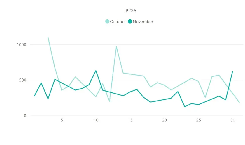 11月の日経平均株価(JP225)は、10月と比べてボラティリティの低下が顕著に表れていた銘柄の1つです。1日当たりの平均ボラティリティは、10月の492.2pipsに対して、11月は328.0pipsと100pips以上低下しました。最大ボラティリティに関しても、10月は1098pipsと非常に大きな値を記録しましたが、11月は633pipsで半分近くに縮小しています。日経平均株価が1日当たりで最大のボラティリティを記録したのは、FX通貨ペアと同じく米国CPIの発表があった10日です。注目のファンダメンタルズ材料が日経平均株価にも影響を与え、ボラティリティが上昇したことが確認できます。