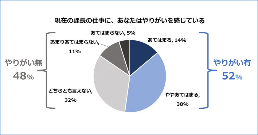 課長のやりがい有無を分析するため、以降では「あてはまる+ややあてはまる」と回答した52%を「やりがい有」、「どちらとも言えない+あまりあてはまらない+あてはまらない」と回答した48%を「やりがい無」とします。