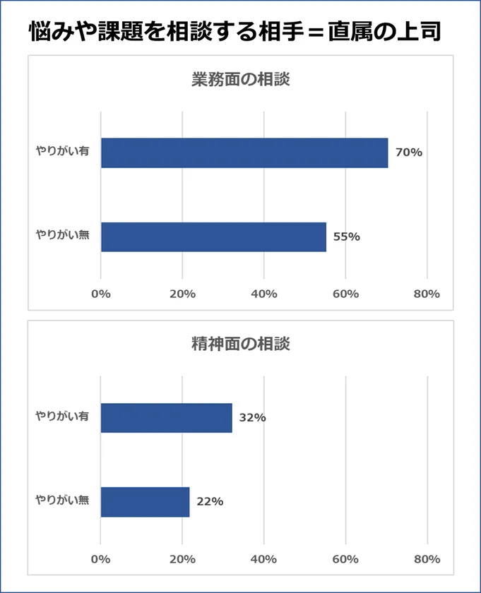 また、やりがいの有無に関わらず直属の上司は精神面の相談相手になっている割合が少ないことが分かりました。