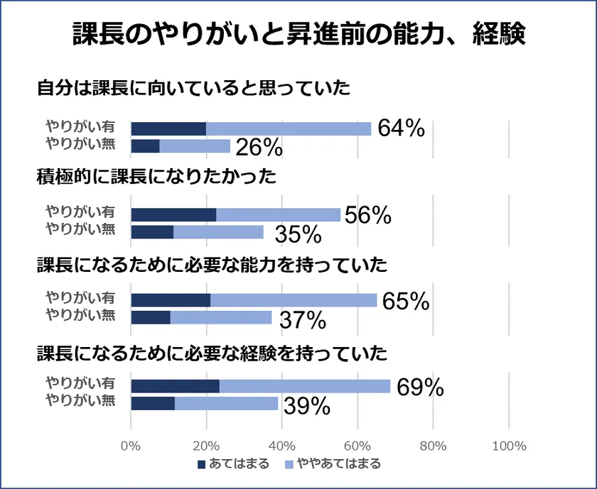 また、課長になるための能力、経験について、やりがい有無で大きな差があることが分かりました。