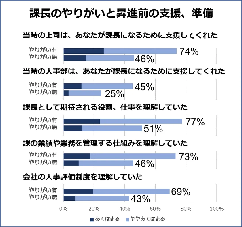 また昇進前に課長として必要になる、役割、仕組み、人事評価の理解についても、「やりがい有無」で差があることが分かりました。