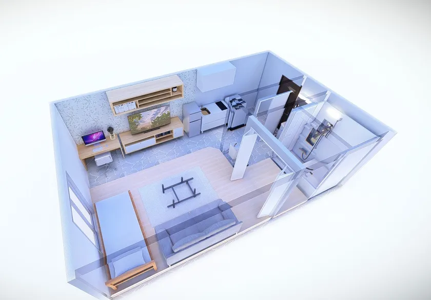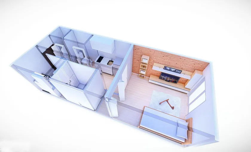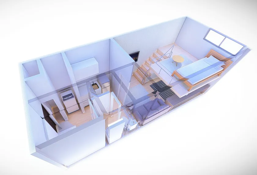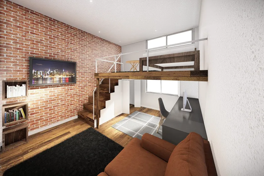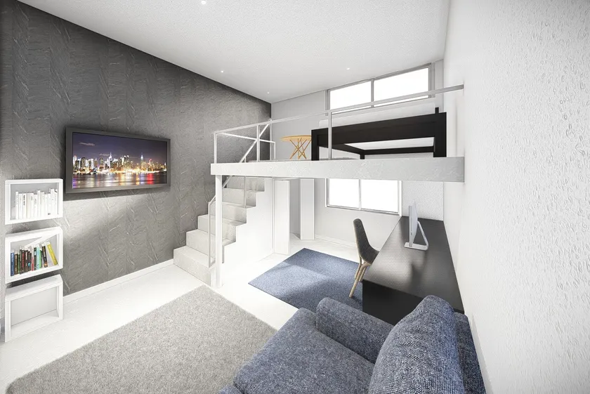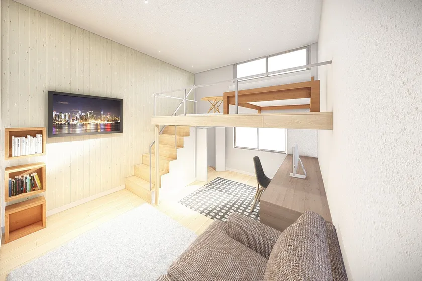 エポックかくれ家は、ステップフロアになっており、1Rながらリビングスペースとベッドスぺースを別々にすることで、下段は大空間と収納、階段上には落ち着いたベットスペースでゆっくりお休みいただくことのできる、居住者様にはご満足いただける造りとなっております。