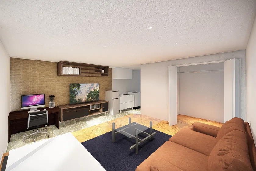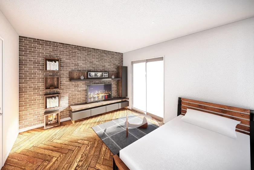 ・レンガ調の壁紙にヘリンボーンの床を合わせニューヨークのブルックリンの様なお部屋に仕上がっております。