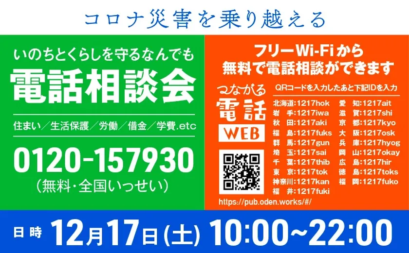 コロナ災害を乗り越える いのちとくらしを守る なんでも電話相談会実行委員会では、12月17日(土)に新型コロナウイルス感染症の影響による生活困窮者向けに、住まい・生活保護・労働・借金などに関する無料電話相談会【第17弾(最終会)】を開催いたします。