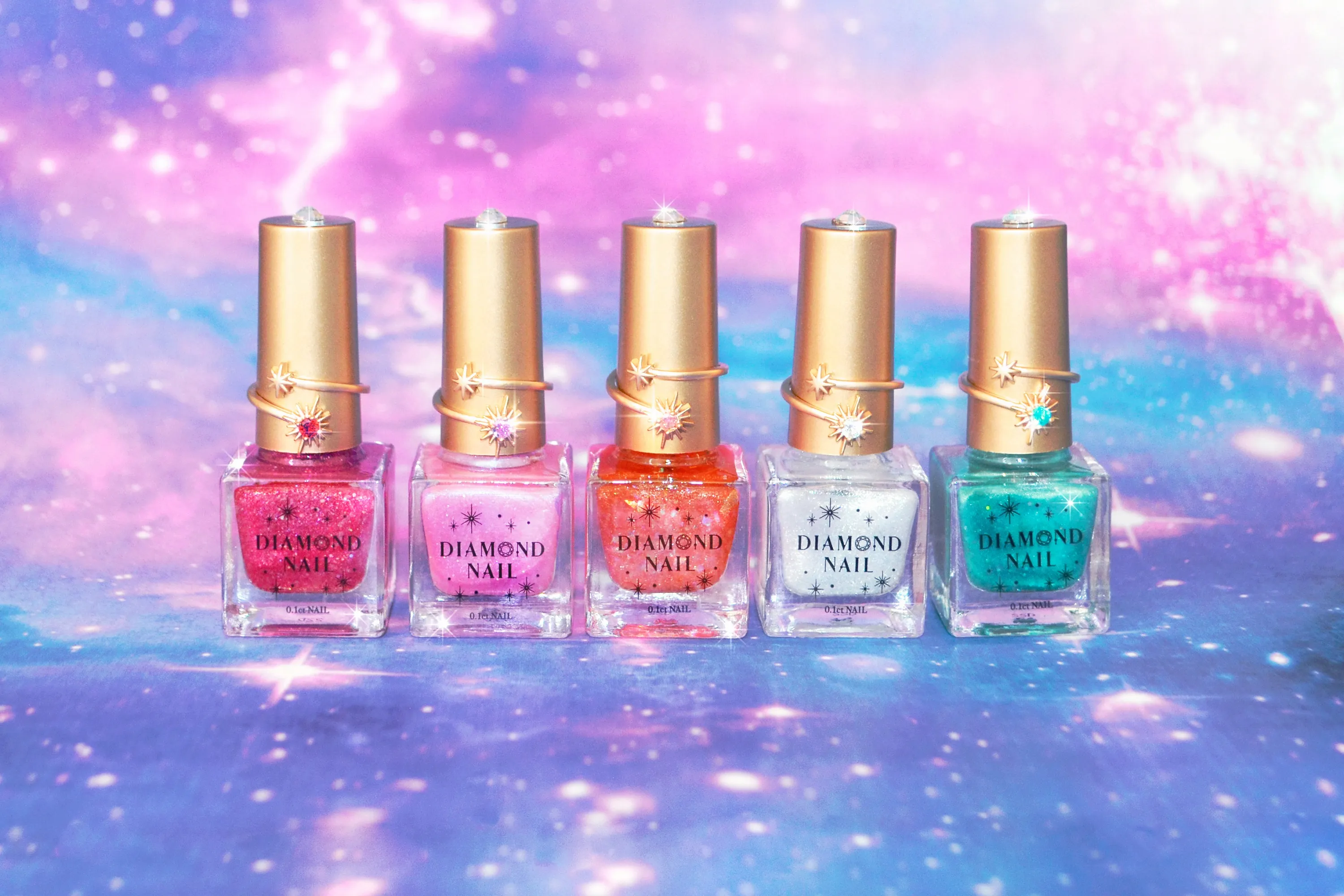 天然ダイヤモンド0.1ctの粉末を贅沢に使用したネイルカラーで、カラーは星屑のベール、ばら星雲、火星の夕焼け、おとめの柘榴、ペガサスの夢の全5色。星に願うように、各色に込められた願いにもご注目ください。 キャップのリングは指輪としてお使いいただけます。ネイルと合わせてコーディネートをお楽しみください。