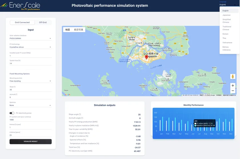 シンガポール発のサービスであるEnerScaleは、将来の太陽光パネル大量廃棄に伴い、リユース・リサイクルの事前評価を可能にするプラットフォームです。EnerScaleプラットフォーム開発の一環で使用している太陽光発電システムのパフォーマンスシミュレーションをEnerScale for PV Performance日本語版として公開しました。主に衛星データを活用した日射量推定により、様々な地域・条件でのシミュレーションが可能で、英語・簡体字・繁体字・韓国語・ベトナム語・タイ語・インドネシア語でも提供しています。