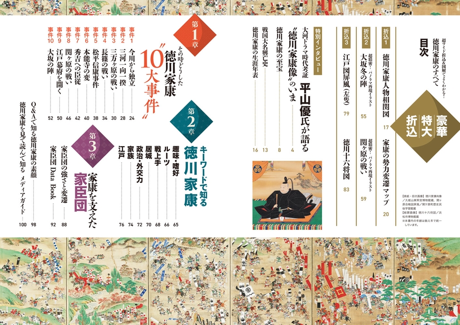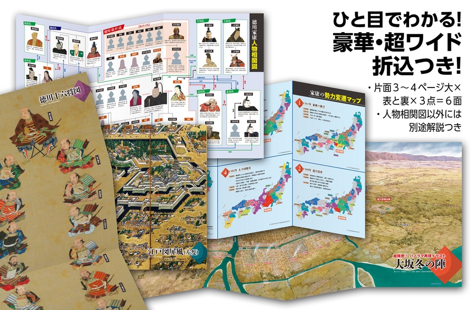 本書の特徴のひとつが、豪華ワイド折込が3点、計6面付いている点です。内容は以下の通りです。①人物相関図、②勢力変遷マップ、③超精密!パノラマ再現イラスト「関ヶ原合戦」、④同「大坂冬の陣」、⑤江戸図屏風、⑥徳川十六将図。