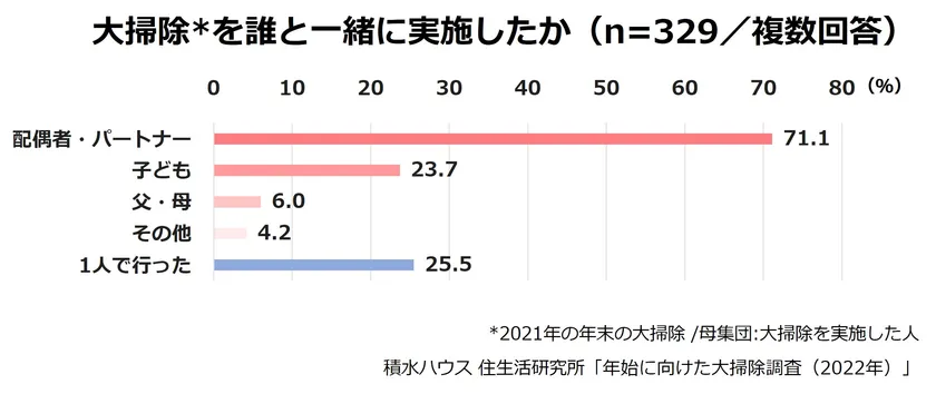 大掃除を誰と実施したかを聞いたところ、「配偶者・パートナー」が71.1%と最も多く、続いて「子ども」が23.7%でした。年末の大掃除は家族と実施している人が多いようです。