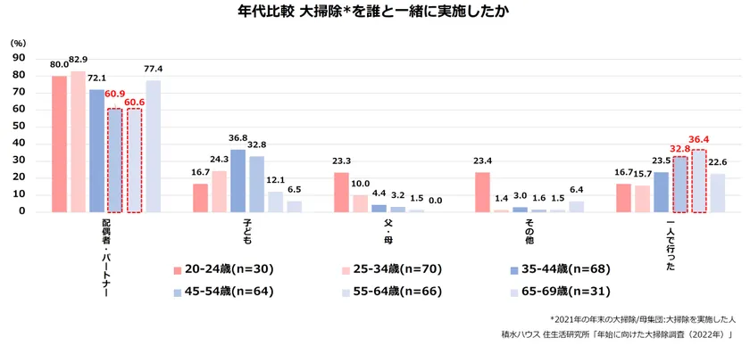 一方、大掃除を「1人で行った」人は約4人に1人でした。さらに、年齢があがるにつれ「1人で行った」人が増え、45歳~54歳で32.8%と全体比7.3ポイント増、55歳~64歳では36.4%と全体比10.9ポイント増と、配偶者・パートナーの関与が減りました。ただ、大掃除の満足度の高かった65~69歳においては、25~34歳、20~24歳に続き、1人で行う割合が低い結果となりました。