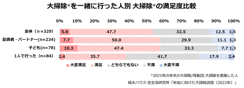 大掃除の満足度について、配偶者・パートナーと一緒に実施した57.7%の人が満足(大変満足または満足)と回答し、子どもと一緒に実施した人においても57.7%が満足と回答しました。一方、1人で行い大掃除に満足した人は38.1%に留まり、配偶者・パートナー、子どもと実施した人との差は19.6ポイントにも及びました。年始を気持ちよく迎えるためにも、大掃除は家族みんなで協力したいものですね。