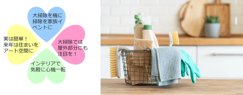 調査では、コロナ禍の掃除の実態や昨年の大掃除の実態によって、「満足する大掃除」につながるヒントが見つかりました。大掃除の仕方や体制を見直すことで、より気持ちの良い新年の準備ができるようになるかもしれません。なお、大掃除に満足した理由には「新たなスペース」「模様替え」などのポイントが多かったように、新年に向けて「空間づくり」にもチャレンジしてみてはいかがでしょうか。ここでは、気持ちよく新年を迎えるための新年の準備に盛り込みたい4つの「幸せTips」をお掃除・空間づくりの観点からご紹介します。