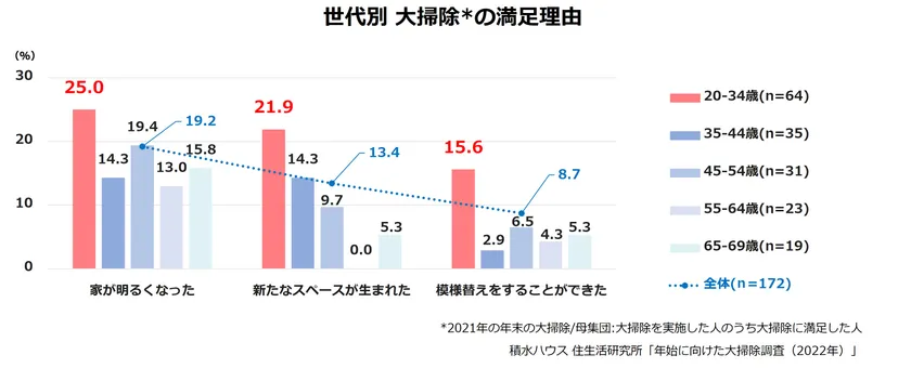 大掃除に満足している人にどのような点で満足しているかを聞いたところ、全体では「綺麗になった」59.9%、「清潔になった」50.6%、「新年を迎える準備ができた」41.3%、と続きました。大掃除の満足度の高い層である20~24歳、25歳~34歳における満足したポイントとして「新たなスペース」や「模様替え」「家が明るくなった」など空間づくりにおける項目が全体と比較して差が目立つ結果となりました。コロナ禍でおうち時間が増えたことにより、自宅で過ごす空間を見直している人が多いようです。大掃除においても、単純に綺麗にするだけでは留まらない、空間づくりという新たな観点が満足度につながってきていることがわかります。