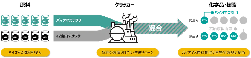 「原料から製品への加工・流通工程において、ある特性を持った原料(例:バイオマス由来原料)がそうでない原料(例:石油由来原料)と混合される場合に、その特性を持った原料の投入量に応じて、製品の一部に対してその特性の割り当てを行う手法」(環境省バイオプラスチック導入ロードマップ)を言います。