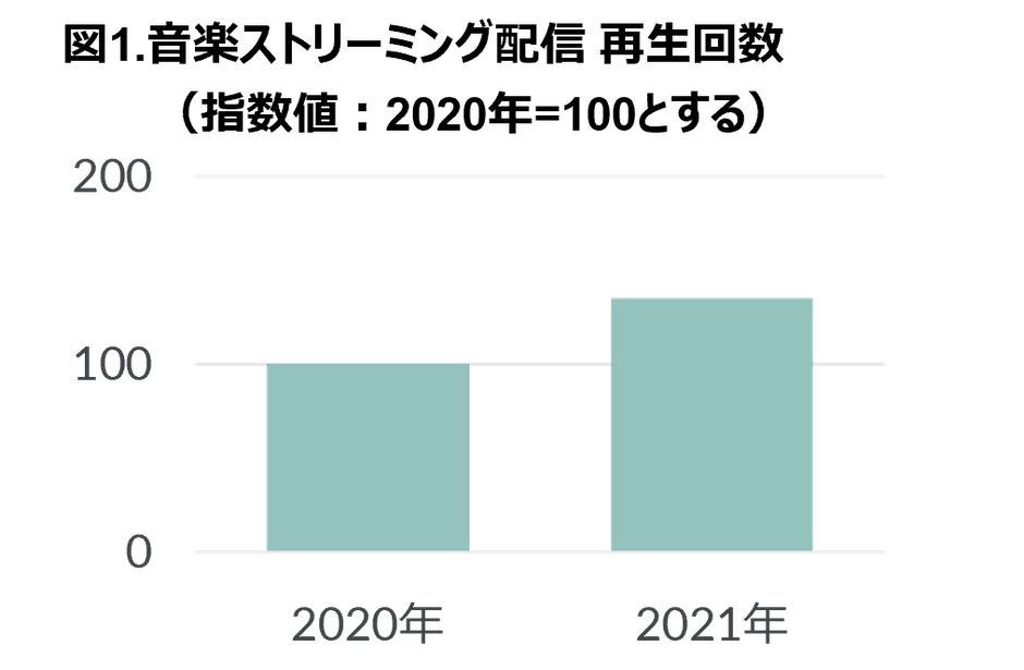 音楽ストリーミング配信市場は、ストリーミング配信の利用拡大に伴い年々成長しており、 ピーク時より伸長率が下がっているものの2021年の再生回数は前年の1.3倍超となった(図1)。