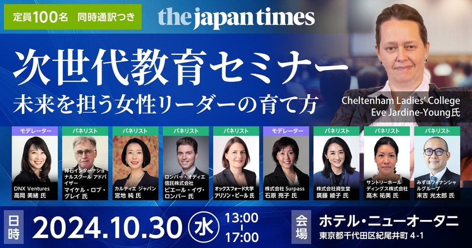 株式会社ジャパンタイムズ(本社:東京都千代田区 代表取締役会長兼社長 末松弥奈子)では、この度、世界トップレベルの女性教育機関であり、今年170周年を迎えるCheltenham Ladies' Collegeの校長、Eve Jardine-Young氏を招聘し、未来を担う女性リーダーの育成に関するセミナーを開催します。