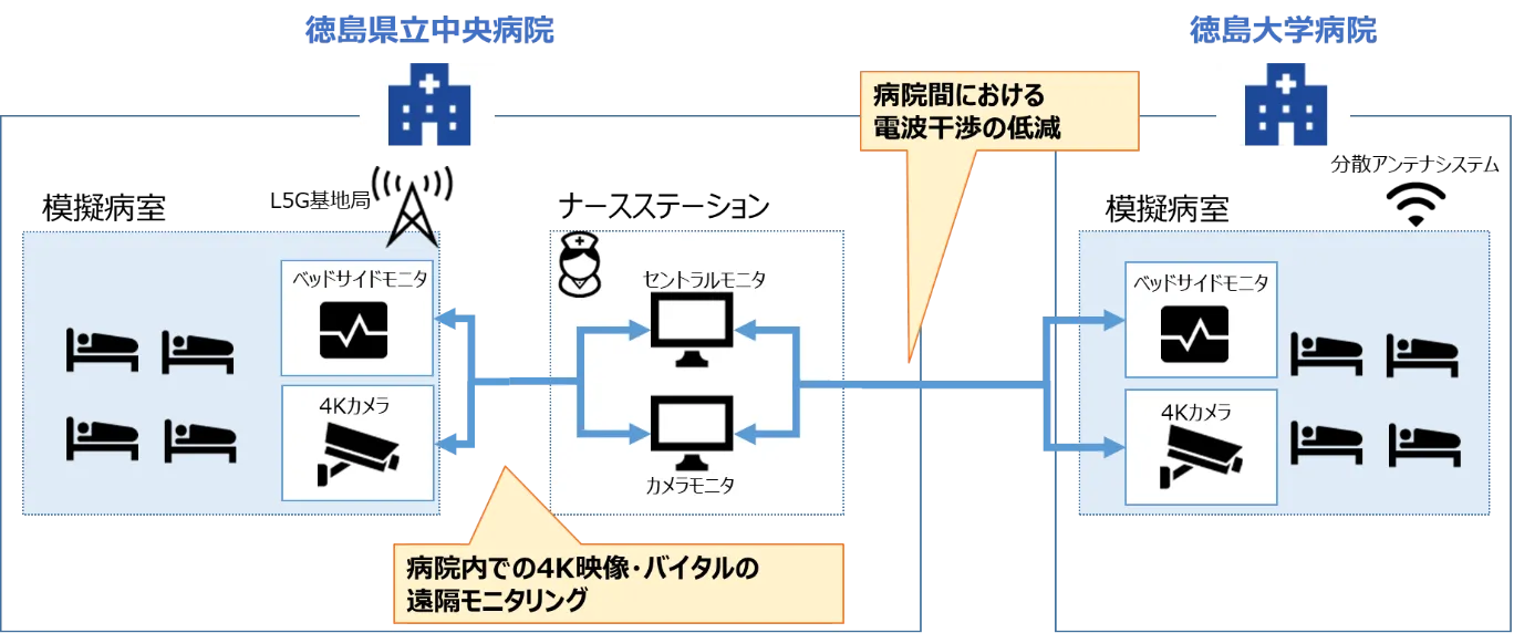 ICUとナースステーションの間で、4Kカメラ映像やベッドサイドモニタのデータをローカル5Gにより無線伝送し、ICUの遠隔モニタリングとローカル5Gの電波干渉対策を検証