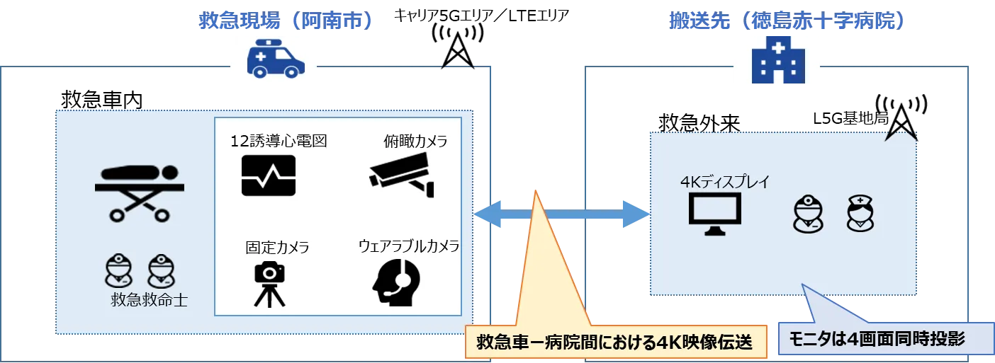 救急車と搬送先病院間のキャリア5Gおよびローカル5Gによる無線接続を行い、搬送中患者の4Kカメラ映像を用いた医療高度化を検証