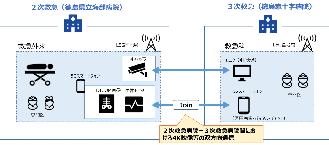 2次救急病院と3次救急病院間をローカル5Gにより無線接続し、患者の4Kカメラ映像やバイタルデータの伝送による医療高度化を検証