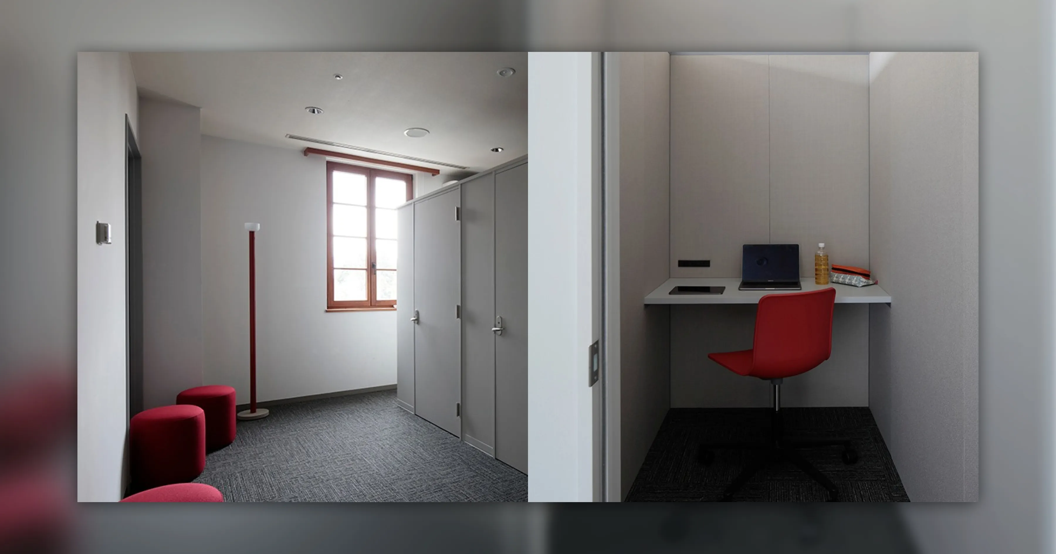 NEST棟で宿泊室として使用されていた2部屋分を連結させてオフィススペースを施工しました。弊社の理想とするWell-beingをオフィスデザインに反映しています。