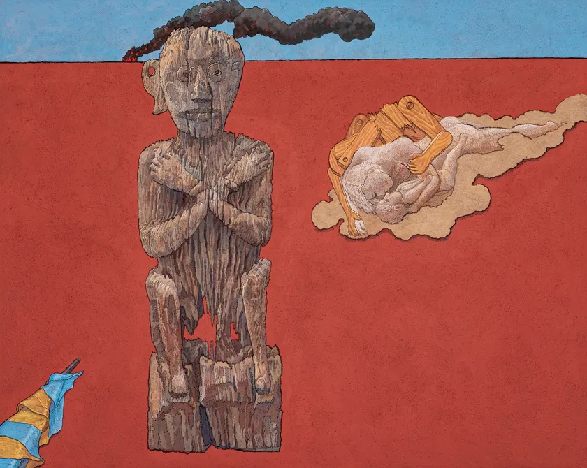 鎮魂と呪術性漂う異形の古代木像は、時と共に万物が朽ち行く無常観を暗示し、その背後には砂中に伏せる母子と、覆いかぶさる木偶が描かれている。澄んだスカイブルーの空の下、赤い地平線の彼方には黒煙が上がり、画面左下にはウクライナ国旗で包まれた機関銃が覗く。