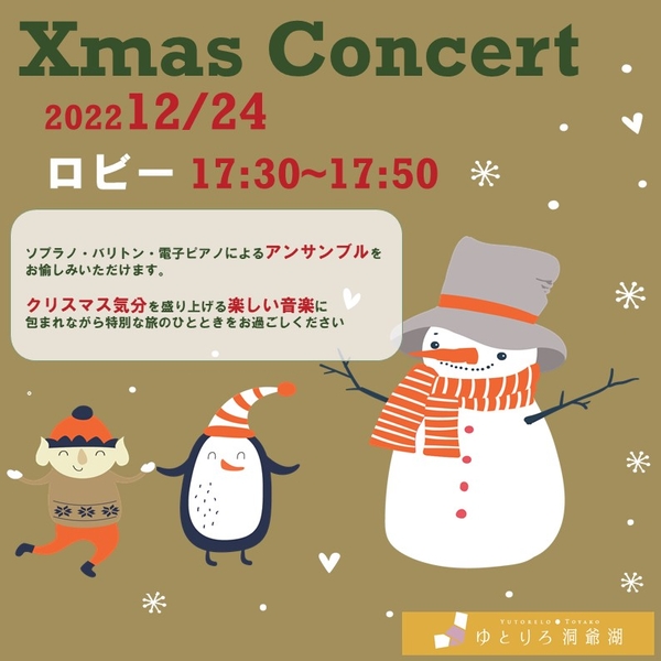 “想いをつむぎ、新しさでつなぐ”Relo Hotels&Resorts(リロホテルズ&リゾーツ)の温泉旅館「ゆとりろ洞爺湖(所在地:〒049-5721 北海道虻田郡洞爺湖町洞爺湖温泉78)」は昨年も大変ご好評いただきましたクリスマスミニコンサートを2022年12月24日(土)開催いたします。今年はどなた様でも気軽にコンサートをお愉しみいただけるよう、公式インスタグラムにてライブ配信も行います。